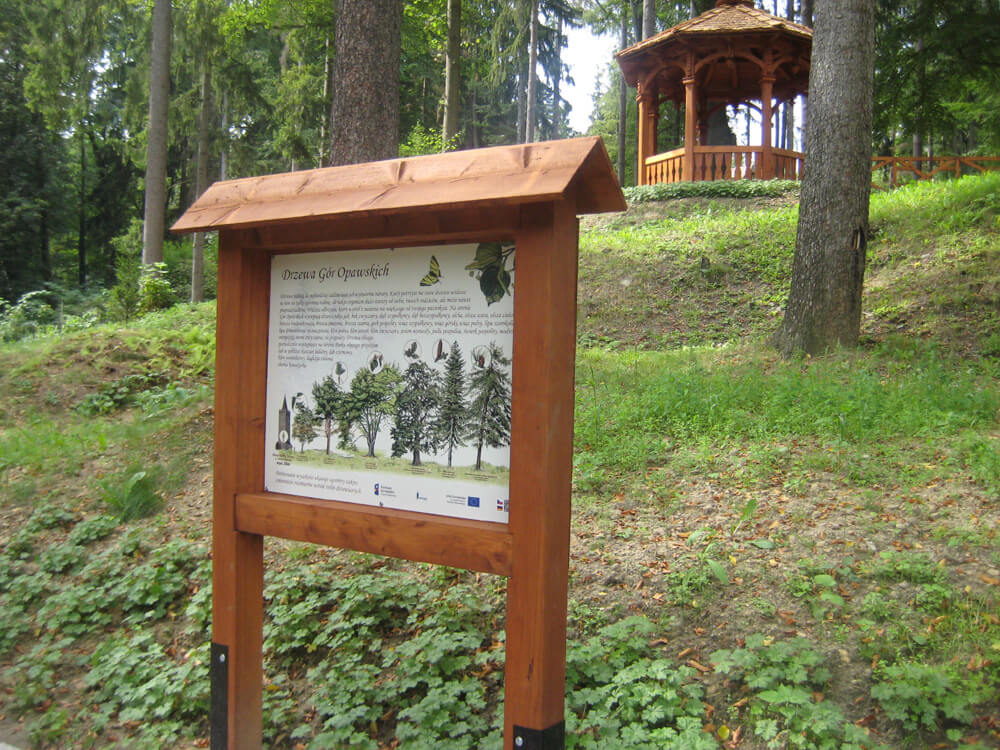 Plac uzupełnia tablica informacyjna „Drzewa Gór Opawskich” – część gatunków można obserwować w naturze w bezpośrednim otoczeniu. W tym miejscu możliwa jest również obserwacja rodzimych ptaków, ponieważ elementem wnętrza jest karmnik. Poniżej tarasu znajduje się tablica „Ślady zwierząt Gór Opawskich”, a dalej na ścieżce umieszczono tablicę „Abecadło Gór Opawskich”, prezentującą najbardziej charakterystyczne rośliny i zwierzęta występujące na tym terenie.